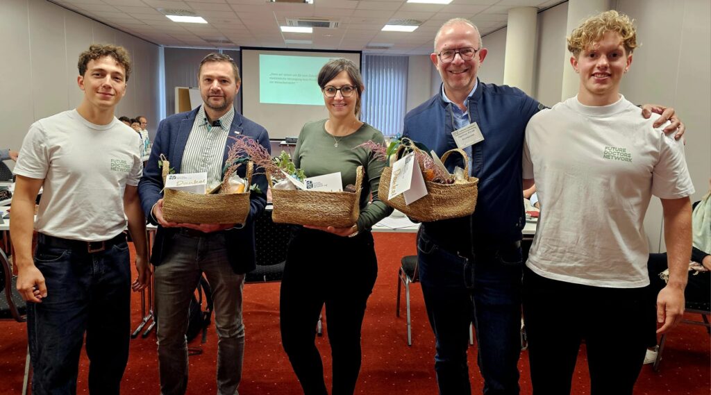 Ein besonderer Moment war die Übergabe von kleinen Präsentkörben an unsere Partner – als Zeichen unserer Dankbarkeit für die bisherige Zusammenarbeit. Auf dem Foto sind von links nach rechts zu sehen: Lukas Arndt (FDN), Jens Könnecke (ConsultingBridge), Anja Feichtinger (Dokuhaus), Hartmut Kiesel (MKD-Kanzlei) und Mattis Bender (FDN).